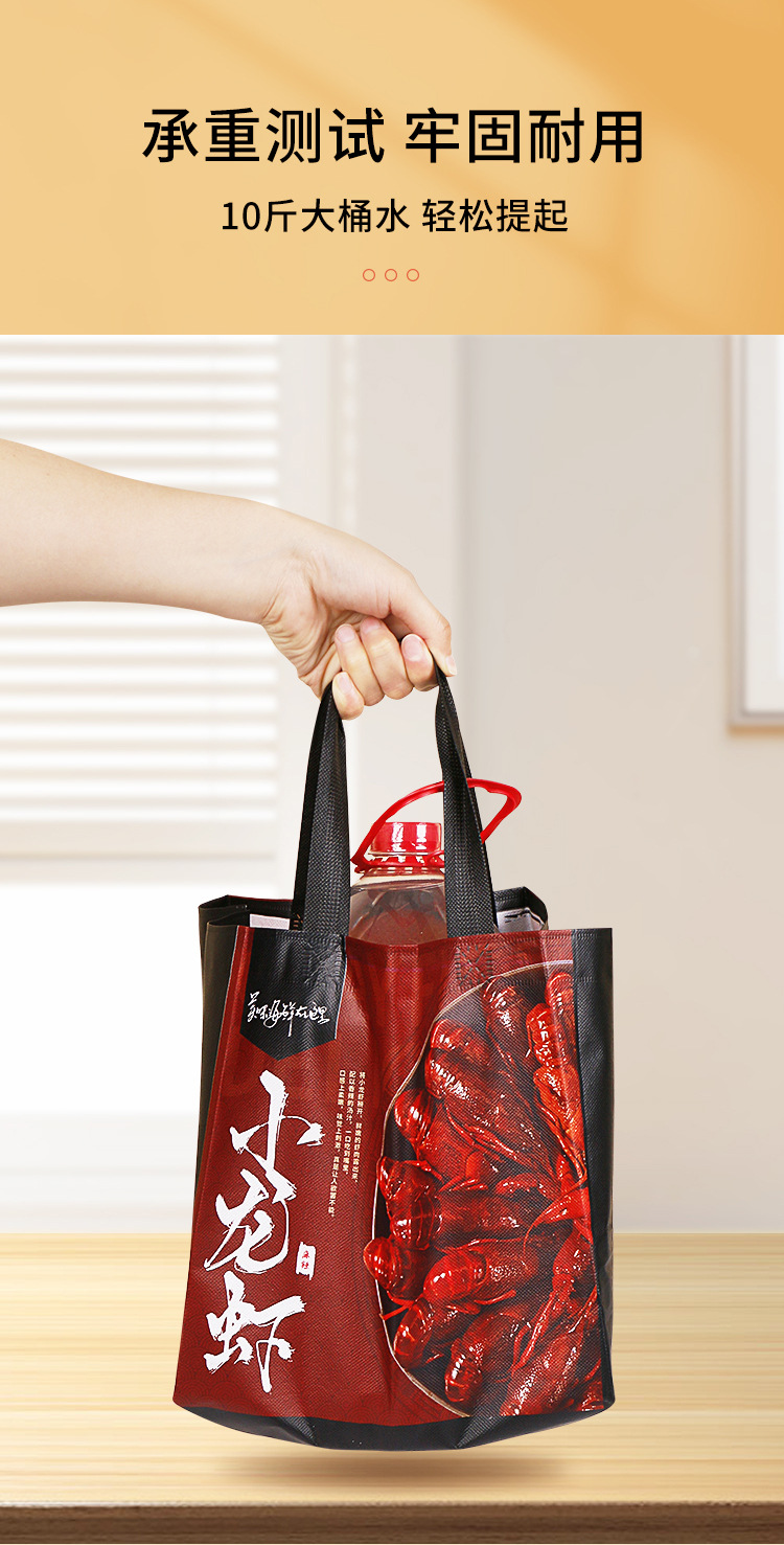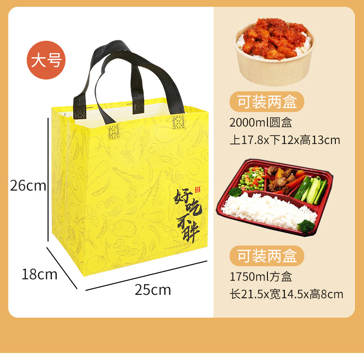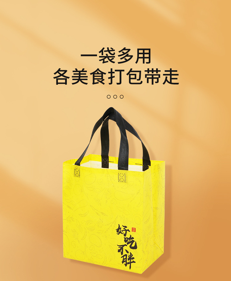 广告宣传:无纺布覆膜外卖袋可以作为商家的广告宣传工具,客户可以在袋子上印上自己的品牌LOGO或宣传语,增加品牌曝光率。