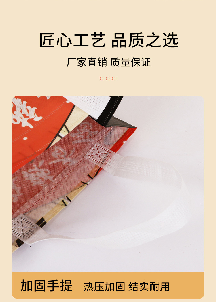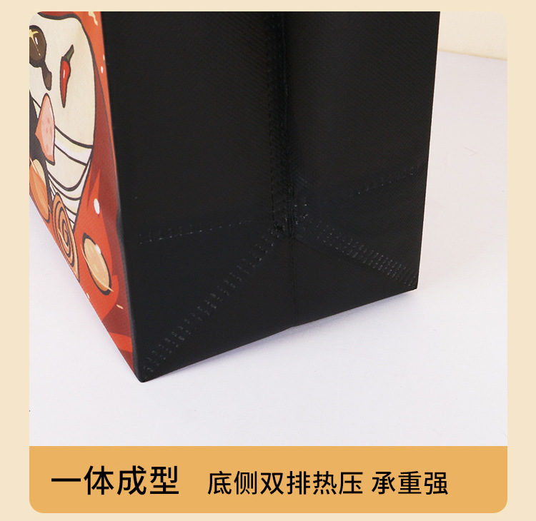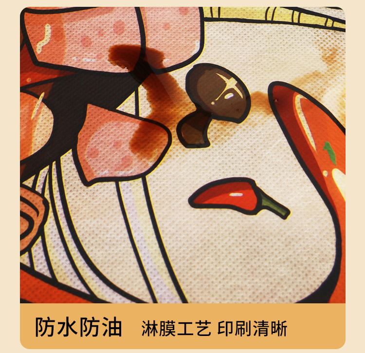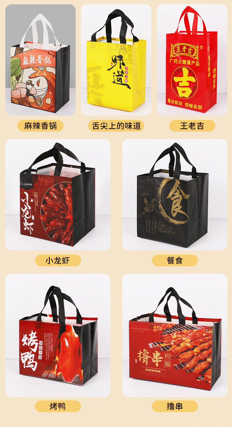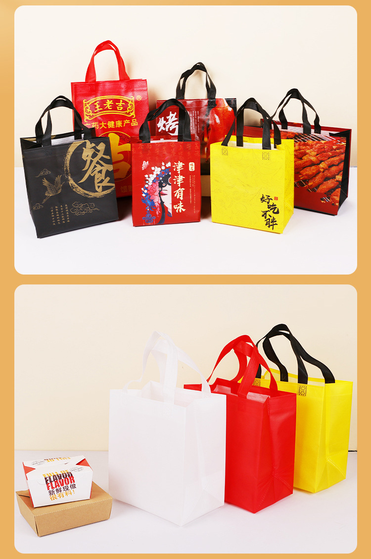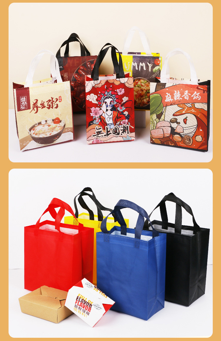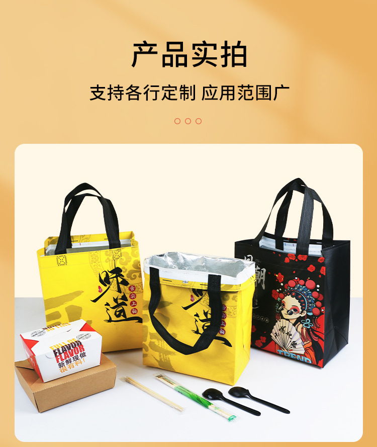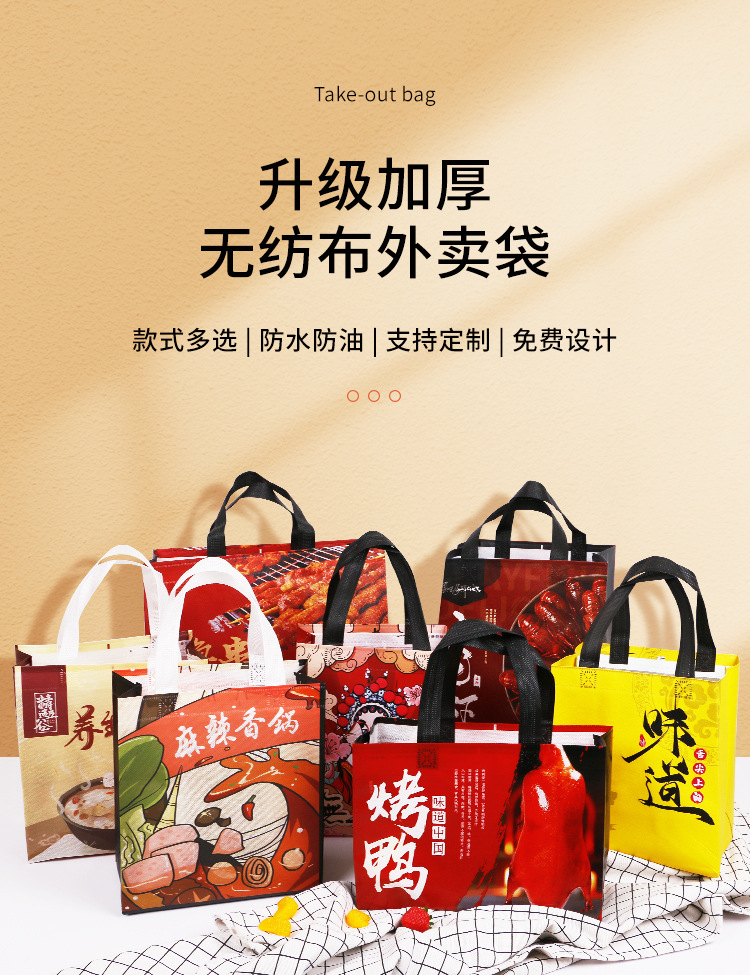 材质选择:无纺布覆膜外卖袋的材质有多种选择,如PP无纺布、PE无纺布、复合无纺布等。客户需要根据使用环境和要求选择合适的材质。